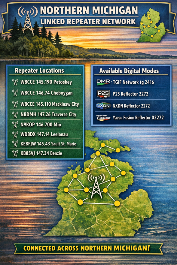 “Welcome to the Northern Michigan Linked Repeater Network. While our primary mission is serving District 7 AuxComm with reliable, wide-area communications, we invite all amateur radio operators to join the conversation. Whether you are a local resident or just traveling through, please use the guide below to connect via our analog repeaters or digital modes.”